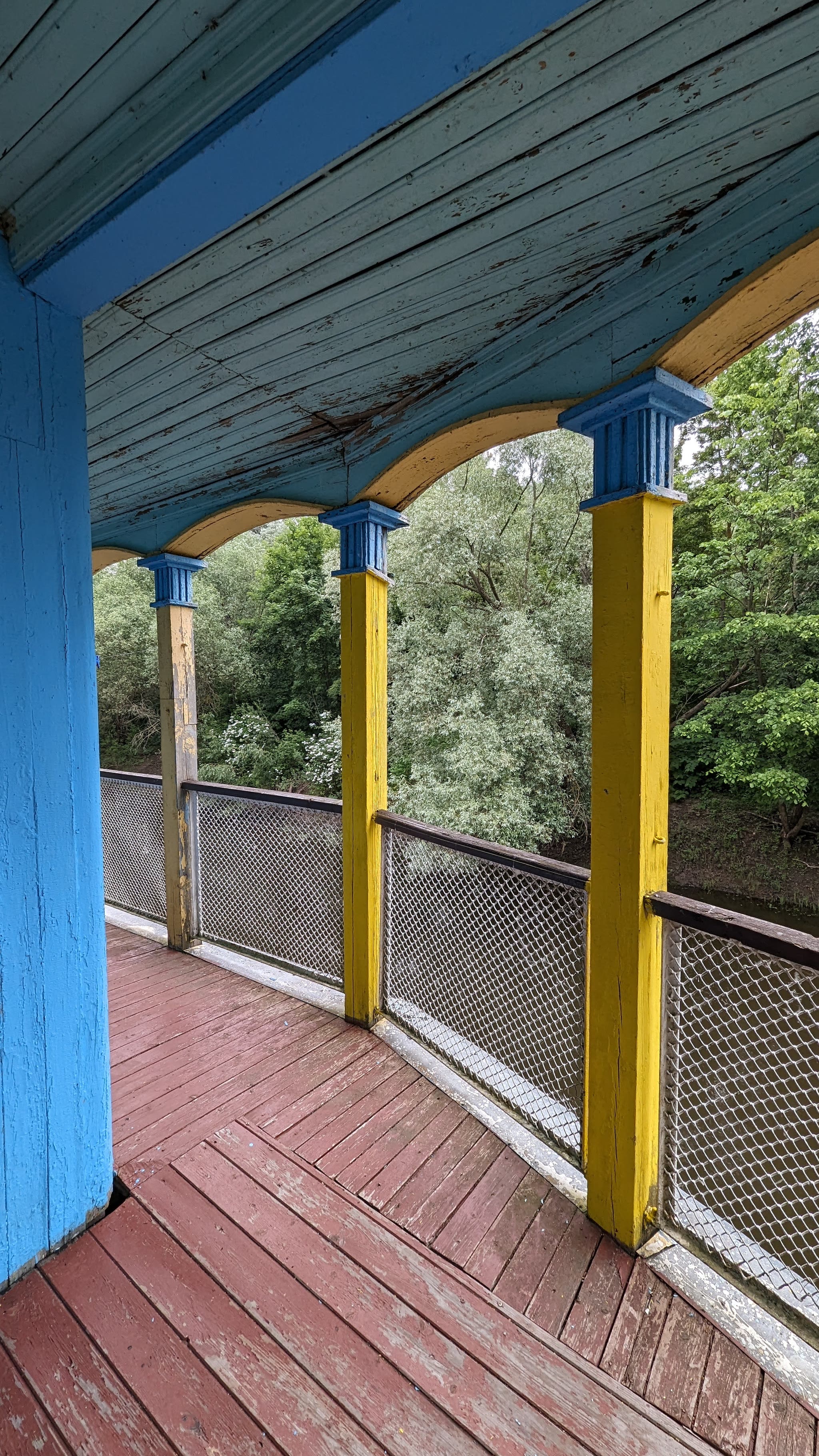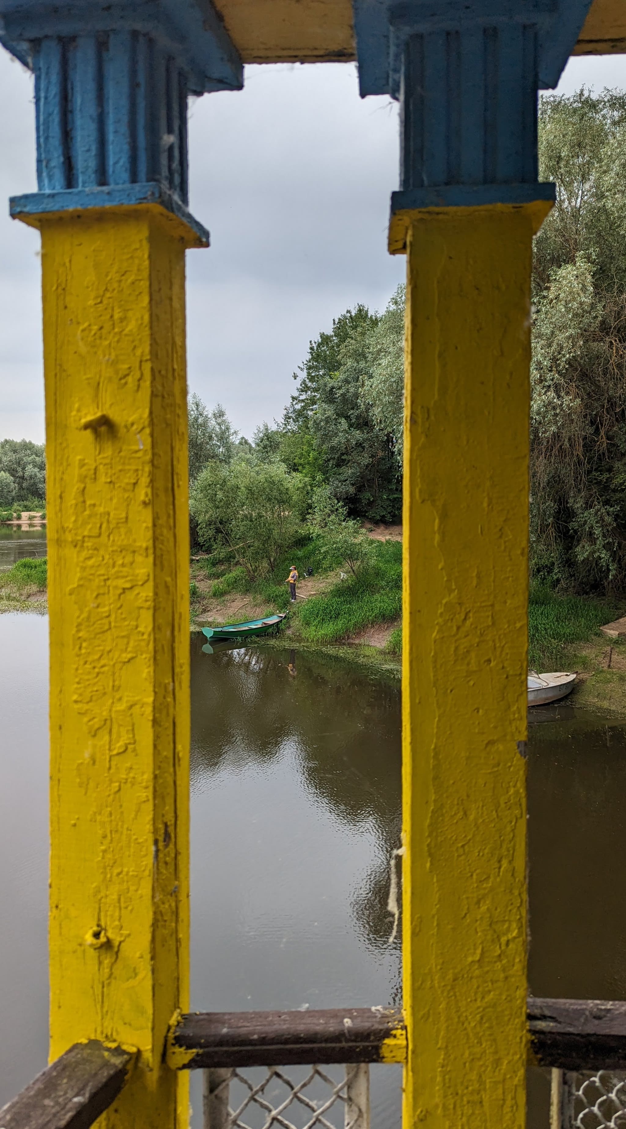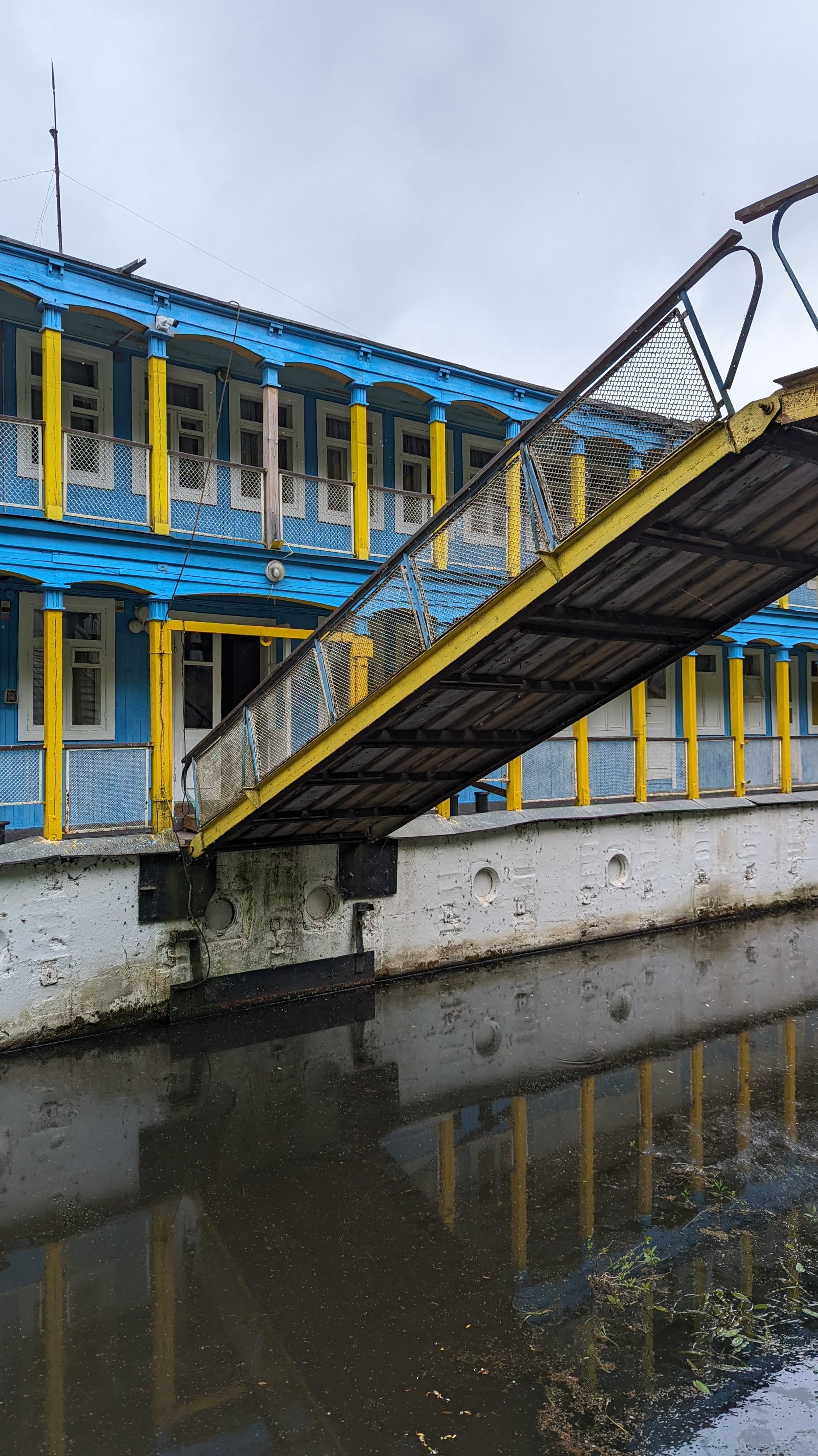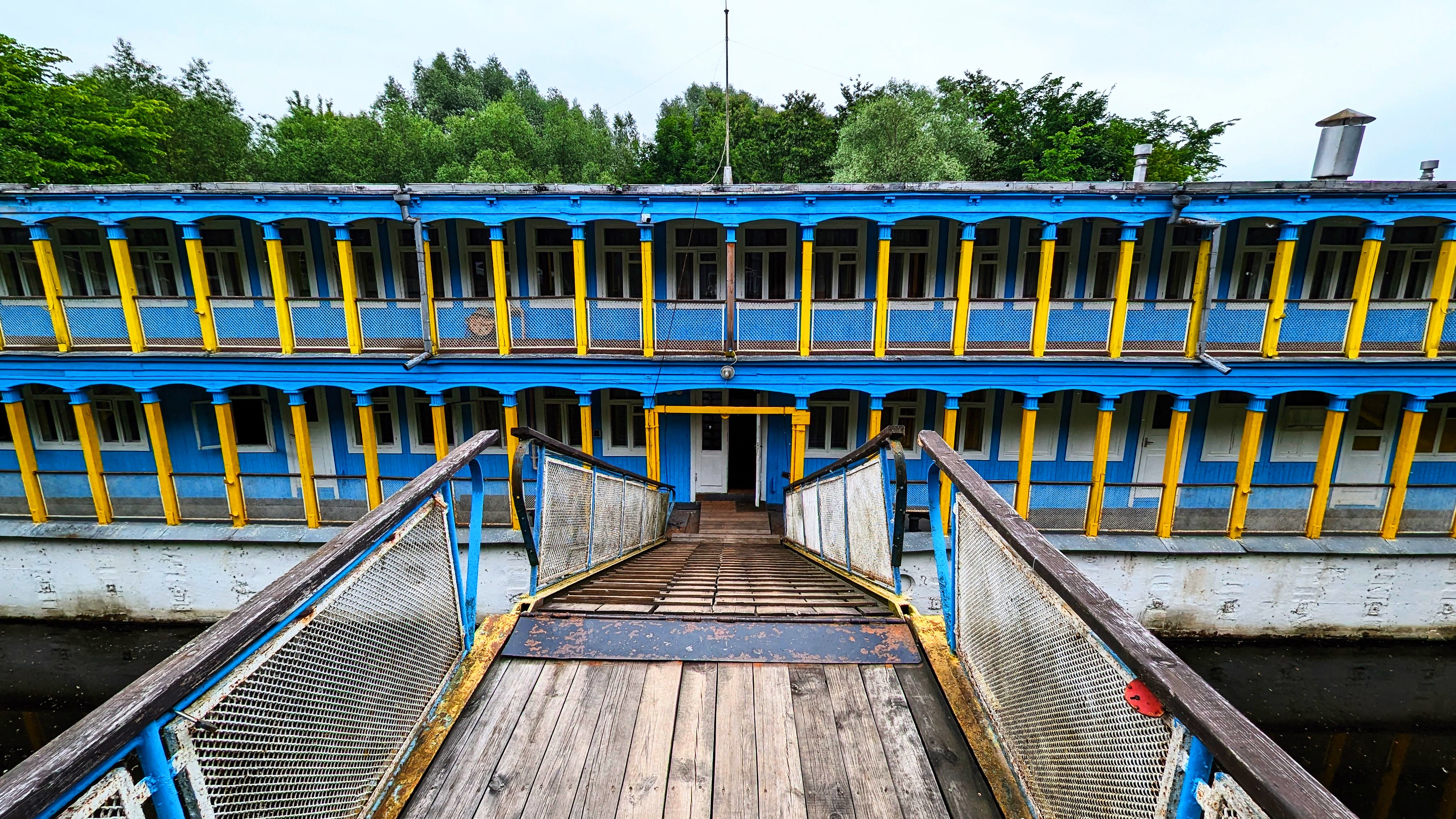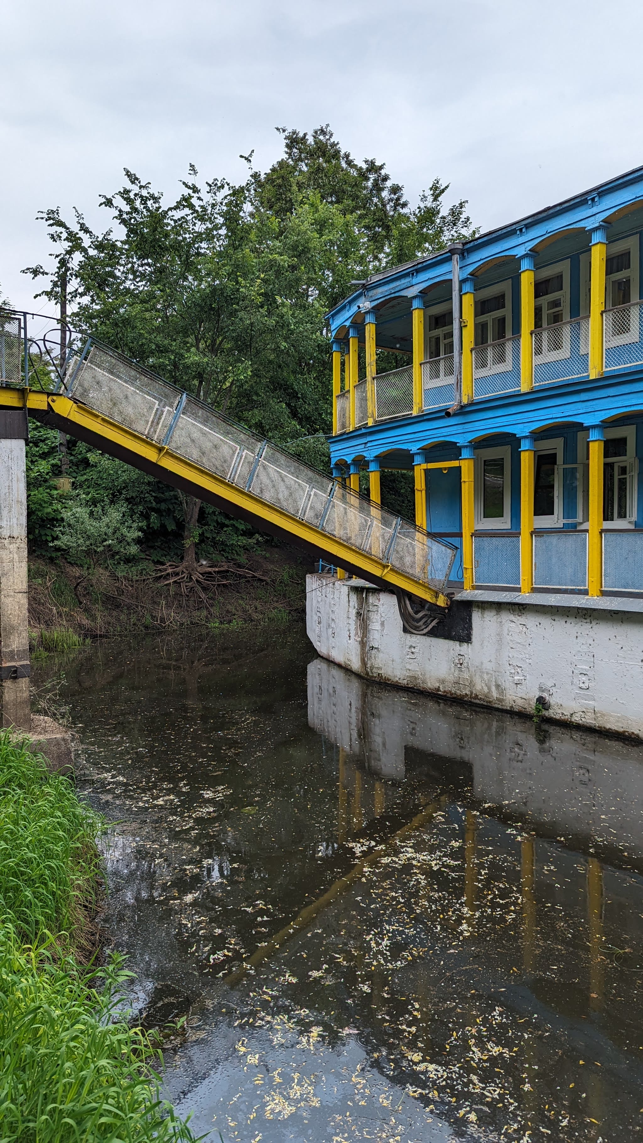 Дебаркадер — не стационарное, а плавучее строение. Поэтому на него с берега ведут подвижные трапы. По следам на столбах видно до какого уровня поднималась вода весной.