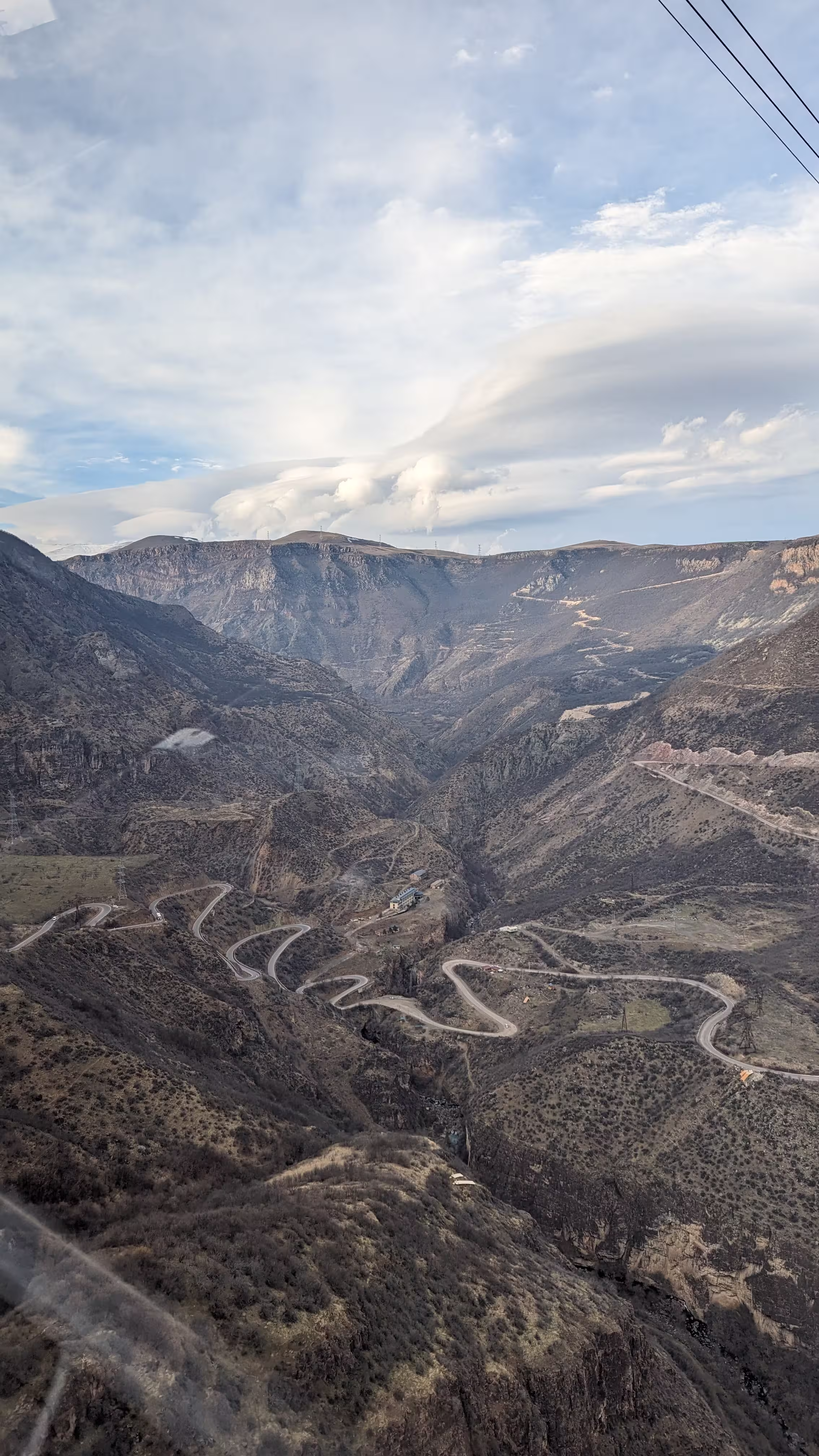 Приехали на Крылья Татева (или Татевскую канатную дорогу). Она считается самой длинной пассажирской канатной дорогой маятникового типа (что бы это ни значило). Длина дороги — почти 6 километров. Она внесена в Книгу рекордов Гиннесса. Меня это удивило, я думал, что всё самое-самое уже в Китае :-)